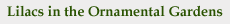 A large number of the Farm's lilacs are in the Ornamental Gardens. These include different types of early, mid, late and very late-blooming types, with starting times beginning the second week of May. Blossoms for each plant generally last for at least two weeks. Lilac blossoms can be seen over a six week period.