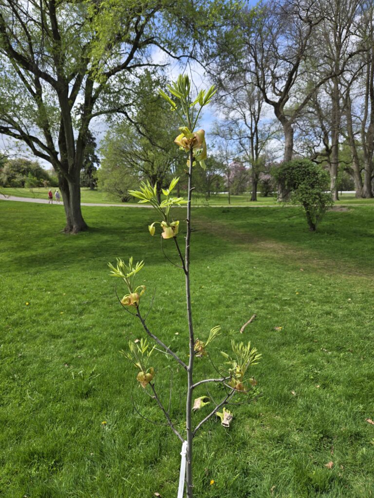 Tulip Tree [2023] — Liriodendron tulipifera — Tulip Trees are iconic tall trees in southwestern Ontario and in the northeastern US, but are rare to be seen in eastern Canada. They are named for their distinctive tulip-shaped leaves. They also have interesting tulip-shaped flowers of yellow, orange and green. The leaves turn an attractive yellow in the fall. They are sometimes called “Yellow Poplar”. Tulip Trees are capable of growing straight and tall (25 metres) in prime locations.