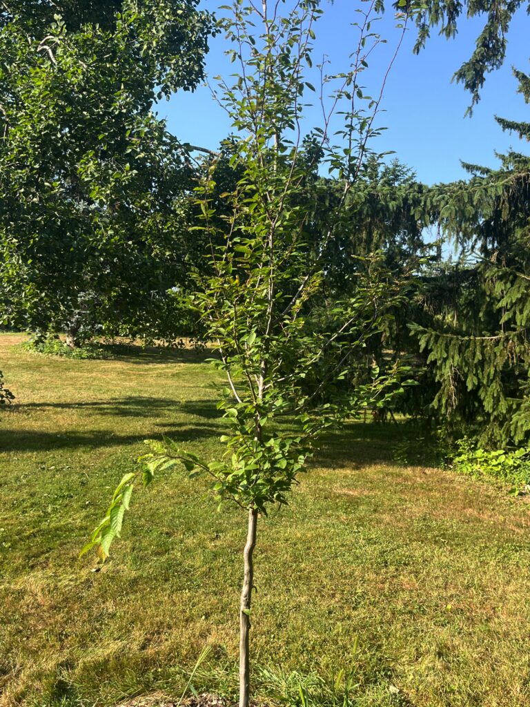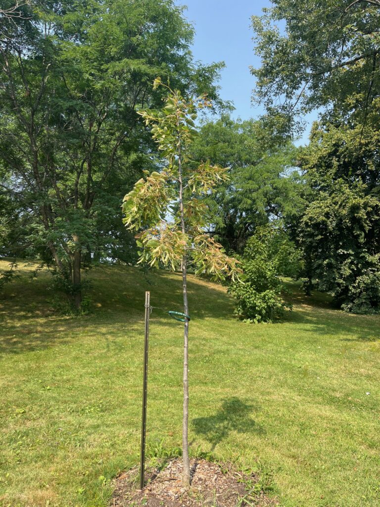 Ohio Buckeye [2023] — Aesculus glabra — Buckeye is a North American tree that is closely related to European horse chestnut trees. The Aesculus genus is noted for the spike of showy flowers in the spring and large whorl of leaves in the summer. Ohio Buckeye leaves may turn pumpkin-orange in the fall, although the colour is variable. Although this tree isn’t commonly planted this far north, it has been shown to be hardy in Ottawa. When it matures, it’s a very pleasant shade tree with round canopy.Its mature height is approximately 10 metres, and its spread about the same.
