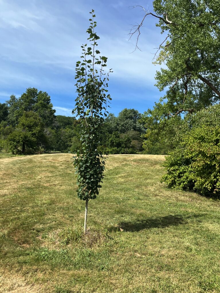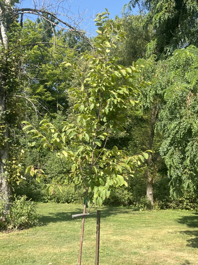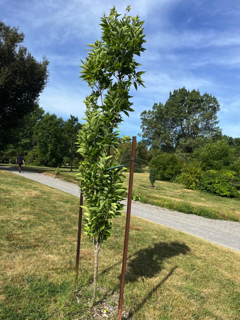 Prairie Sentinel Hackberry—Celtis occidentalis ‘Prairie Sentinel’—Hackberry is a native North American tree that just barely made it into Canada at Ontario’s southern tip. Yet it can survive extreme conditions of cold and drought and is now being planted extensively in Canadian cities. Prairie Sentinel is a fast-growing cultivar that was cloned from a tree found in the United States prairies. It grows into a tall columnar form. The leaves turn yellow in the fall. The tree can grow to 20 metres tall. This tree is located right at the southwest corner between the lowland path and the south path.