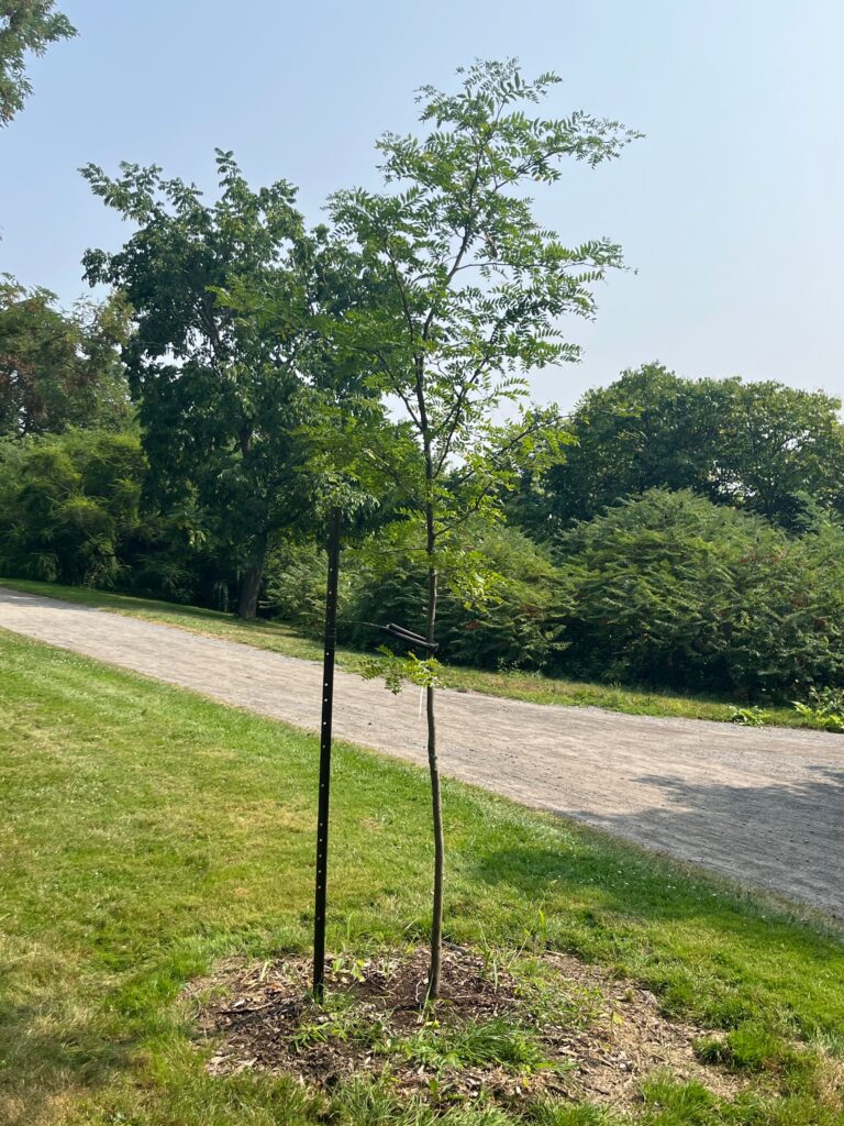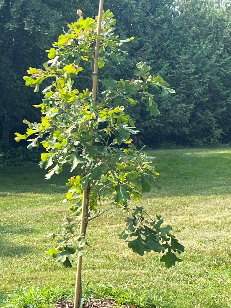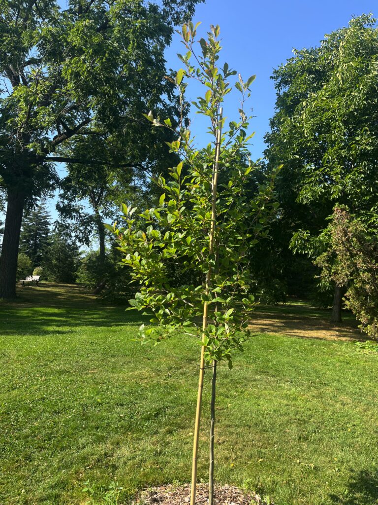 Red Oak [2023] — Quercus rubra — This beautiful and hardy native species is a popular shade tree. In the open, it has a more rounded form than most oak trees; in the forest, it grows tall and straight. Its leaves emerge with a bronze-red colour, and turn a deep scarlet in the fall. Red oak is an important lumber tree used for furniture and flooring among other applications, and many birds and mammals feed on the acorns. Red oak can grow to 20 metres in height and width. This tree is planted right next to the path that runs southeast toward the canal, down in the lowland area just west of the Arboretum’s little island.