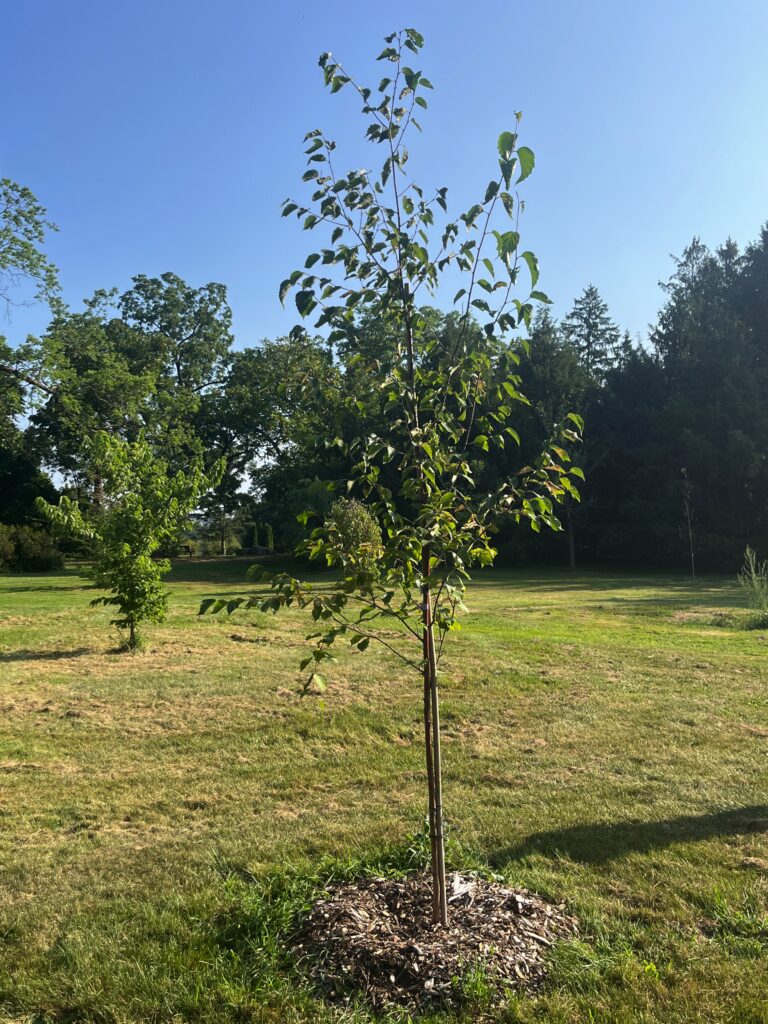 Summer Cascade River Birch [2023] — Betula nigra ‘Summer Cascade’ — River Birch is a resilient tree that should be planted more often in cities due to its resistance to heat and disease. Native to the eastern US, it is hardy here in Ottawa. The bark on young stems and branches turns an attractive salmon colour and, like on other birches, peels away over time. Weeping River Birch grows to be a graceful relatively small tree, typically 10 metres high. The older bark changes to a darker colour and is transformed into irregular plates.