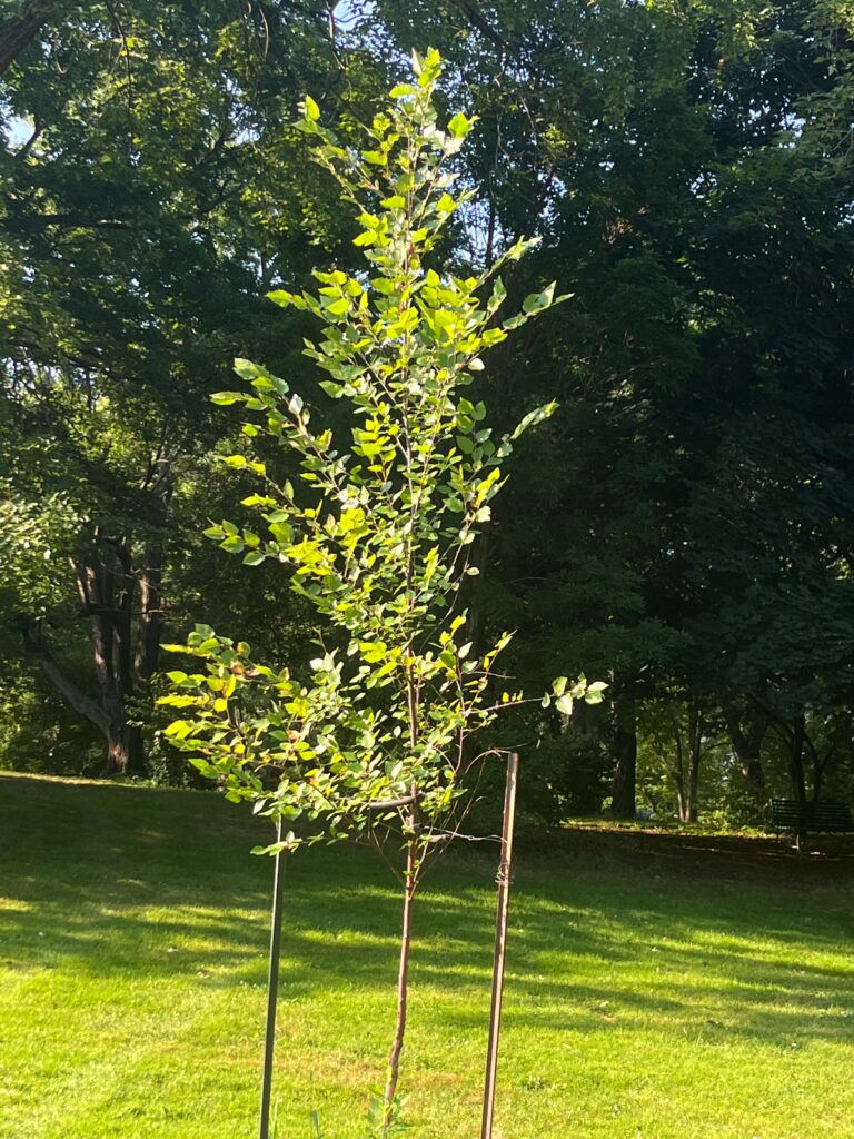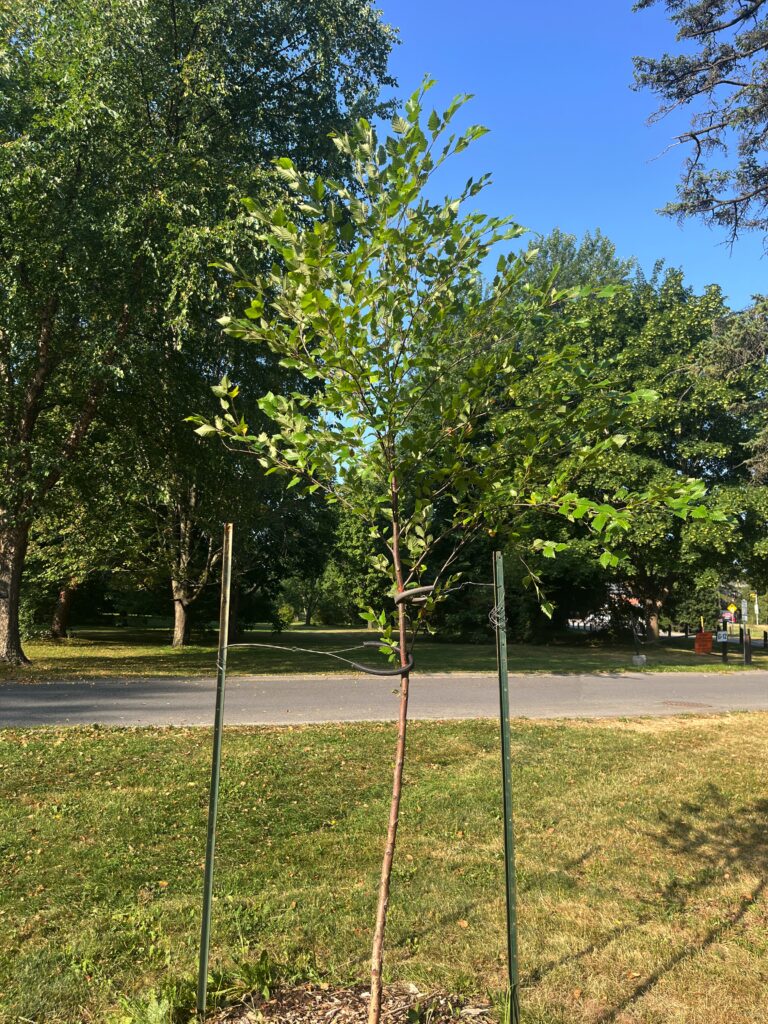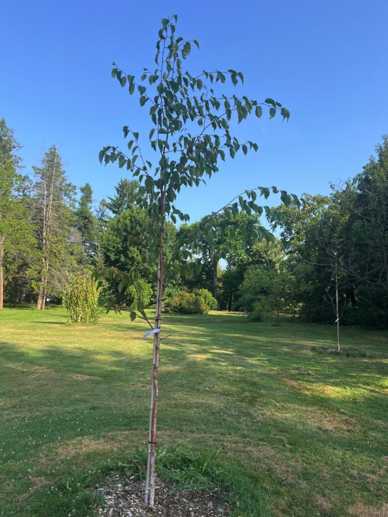 Shiloh Splash Birch [2024] — Betula nigra ‘Shiloh Splash’ — Shiloh Splash is a variety of the hardy River Birch, an underutilized birch species for growing in Ottawa. It is a good selection for urban planting, not being affected by major pests that attack other birches. This cultivar, first discovered at a nursery in North Carolina, is named for its interesting leaves that are splashed with white colour. This is a small but striking tree, growing only about 5 metres tall.