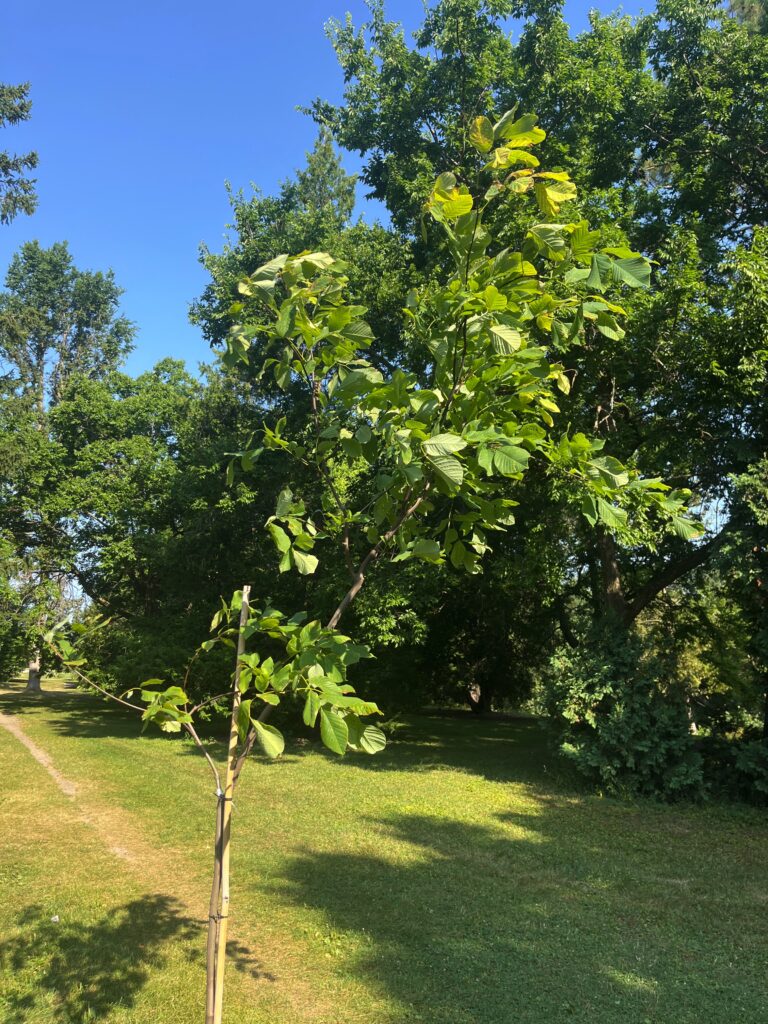 Ironwood [2024] — Ostrya virginiana — Ironwood gets its common name from the hardness of its wood. This native tree is often found in forest understorey around Ottawa, but it is generally overlooked for planting in urban parks and gardens. As it matures, the pyramidal shape becomes more rounded, and the bark takes on an interesting shredded appearance. The tree bears unique clusters of seed pods that somewhat resemble hops (The tree is sometimes called ‘Hop-Hornbeam’). Ironwood trees can grow to about 10 metres in height.